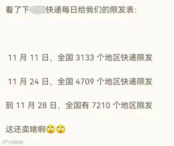 事实上这种状况在今年一直断断续续出现,但此前尚未有近期这般严重。封停范围的扩大,传导到数据端,就是日均2.23亿件的冰点出现。