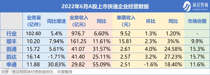 7月18日,顺丰、圆通、申通、韵达发布了6月份业绩简报。