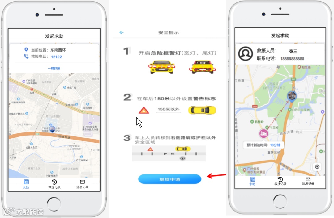 (2)救援管理(司机端):公路护栏设救援二维码,司机扫码进入小程序求助,查看救援距离及人员信息。