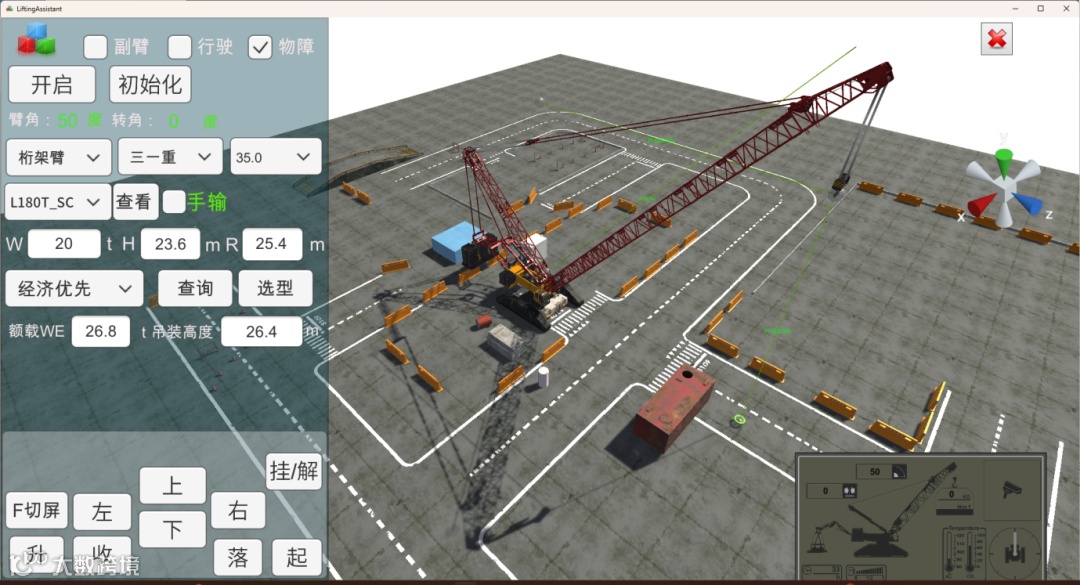 •功能:为新操作手或方案工程师提供虚拟训练场。他们可在高度还原的工业厂区场景(如设备密集区、高耸障碍物旁)中,观察吊臂回转角度控制、吊臂伸缩与变幅协同、障碍物精准避让、复杂空间作业路径规划的全流程。可全程查看吊臂与周边障碍物距离、吊臂回转包络空间。