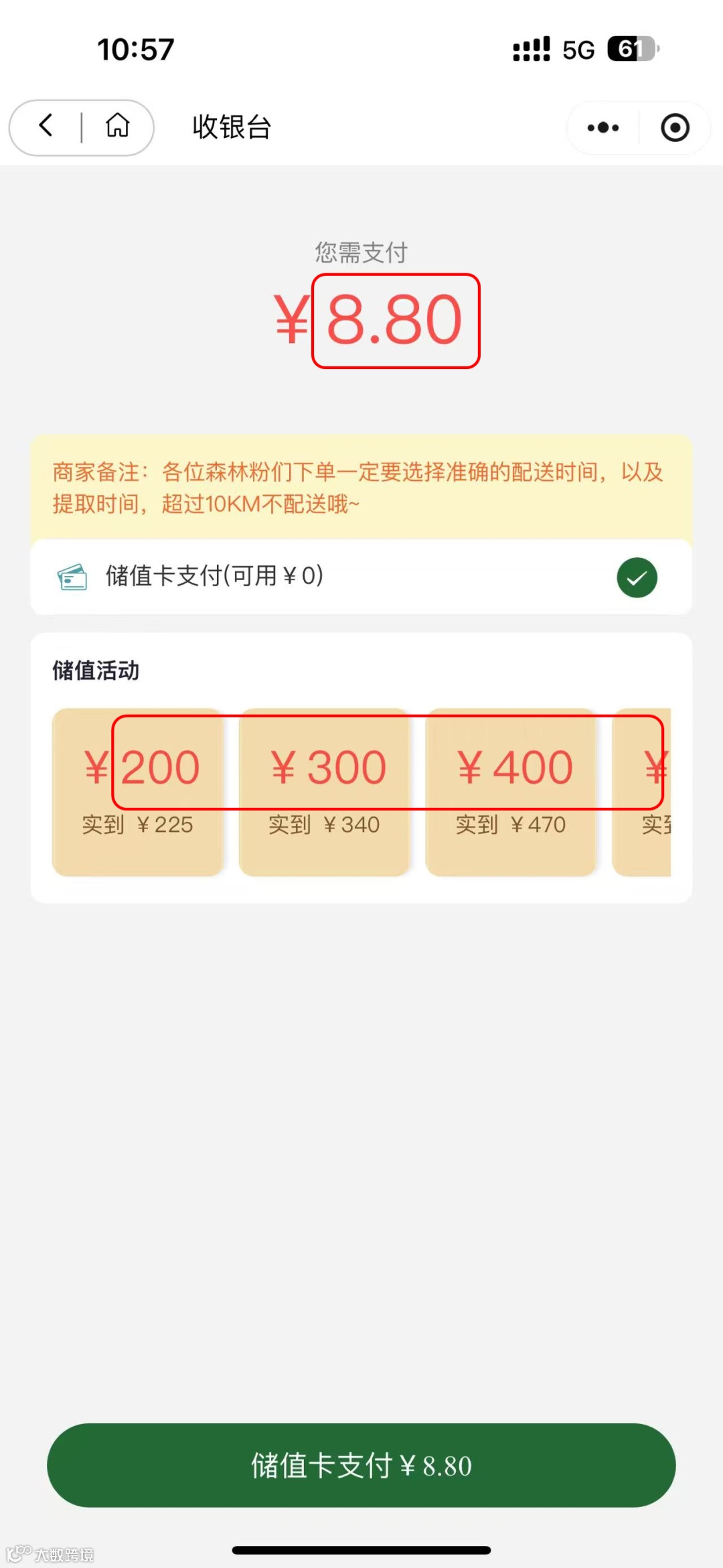 结算时默认使用储值卡支付