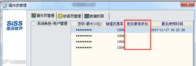 在系统→操作员管理中,商云X增加“批发最低折扣”一栏,可限制操作员制作批发订单、销售单时能给予的最低折扣价,防止操作员随意给折扣。
