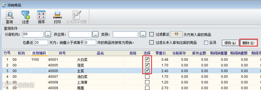 在总部→分析→滞销商品中,原商云8仅支持查看滞销商品,不能选择删除,商云X新增支持删除未发生业务的数据,并增加删除记录功能。