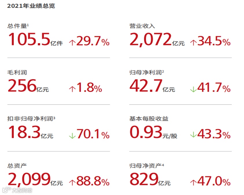 3月30日晚间,顺丰发布的2021年度报告显示,2021年该公司实现营收2072亿元,同比增加34.5%;全年完成总业务量105.5亿票,同比增加29.7%;归属于上市公司股东的净利润42.7亿元。值得注意的是,顺丰的营收突破了2000亿大关,是目前中国第一大、全球第四大快递物流综合服务商。作为一家快递物流综合服务商,顺丰在围绕物流生态圈,持续完善服务能力,业务拓展到时效快递、经济快递、快运、冷运及医药、同城急送、供应链及国际业务(含国际快递、国际货运及代理、供应链)等物流板块,目的是能够为客户提供国内及国际端到端一站式供应链服务。