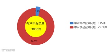 2.受理的申诉中有效申诉(确定企业责任的)为3086件,环比增长10.4%,同比增长106.4%。有效申诉中涉及邮政服务问题的115件,占有效申诉量的3.7%,环比增长12.7%,同比增长94.9%;涉及快递服务问题的2971件,占有效申诉量的96.3%,环比增长10.3%,同比增长106.9%。