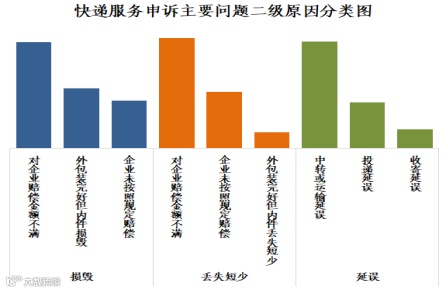 快件损毁申诉中主要占比是对企业赔偿金额不满,快件丢失短少申诉中主要占比是对企业赔偿金额不满,快件延误申诉中主要占比是中转或运输延误。