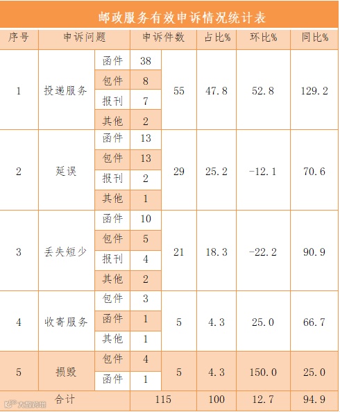 用户对邮政服务问题有效申诉115件,环比增长12.7%,同比增长94.9%。邮政服务有效申诉的主要问题是投递服务、邮件延误和邮件丢失短少,分别占有效申诉总量的47.8%、25.2%和18.3%。其中,环比增长明显的是投递服务问题,同比均增长明显。