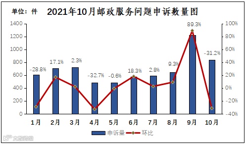 1.2021年10月,国家邮政局和各省(区、市)邮政管理局通过“12305”邮政业用户申诉电话和申诉网站共处理申诉27697件,环比下降0.6%,同比增长57.1%。申诉中涉及邮政服务问题的842件,占总申诉量的3%,环比下降31.2%,同比增长64.1%;涉及快递服务问题的26855件,占总申诉量的97%,环比增长0.8%,同比增长56.9%。