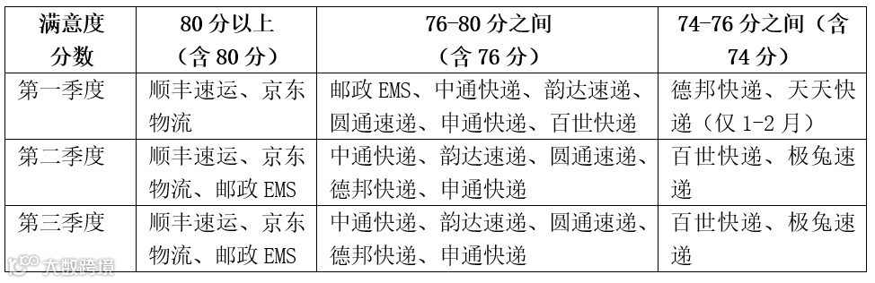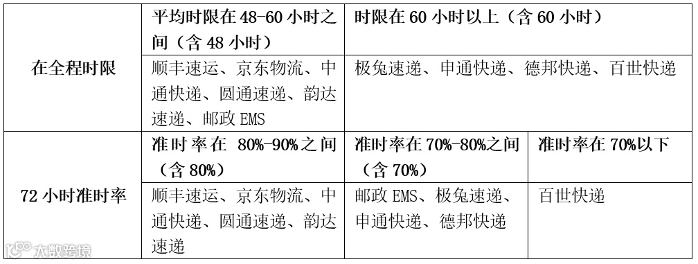 第二季度和第三季度德邦、极兔全程服务时限超60小时;72小时准时率顺丰速运排名第一。
