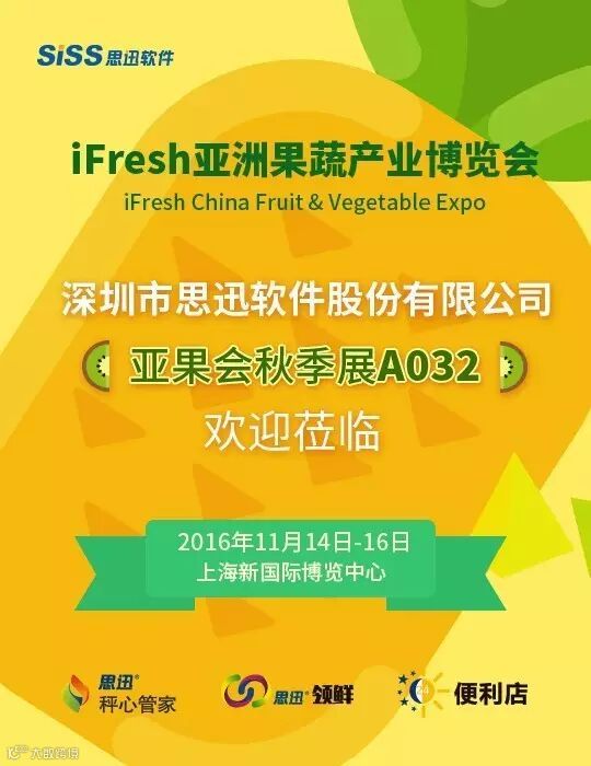 思迅软件新零售产品线将于2016年11月14日至16日在上海新国际展览中心亮相「2016 iFresh亚果会」,展会专注于果蔬全产业链的贸易对接和产品技术展示。