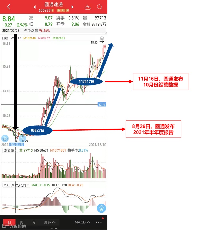 回顾半年来圆通的股价情况可以发现,自7月28日创出新低(8.84元)后,圆通股价经历了两轮上涨,最终达到最高18.1元,累计涨幅超过一倍。