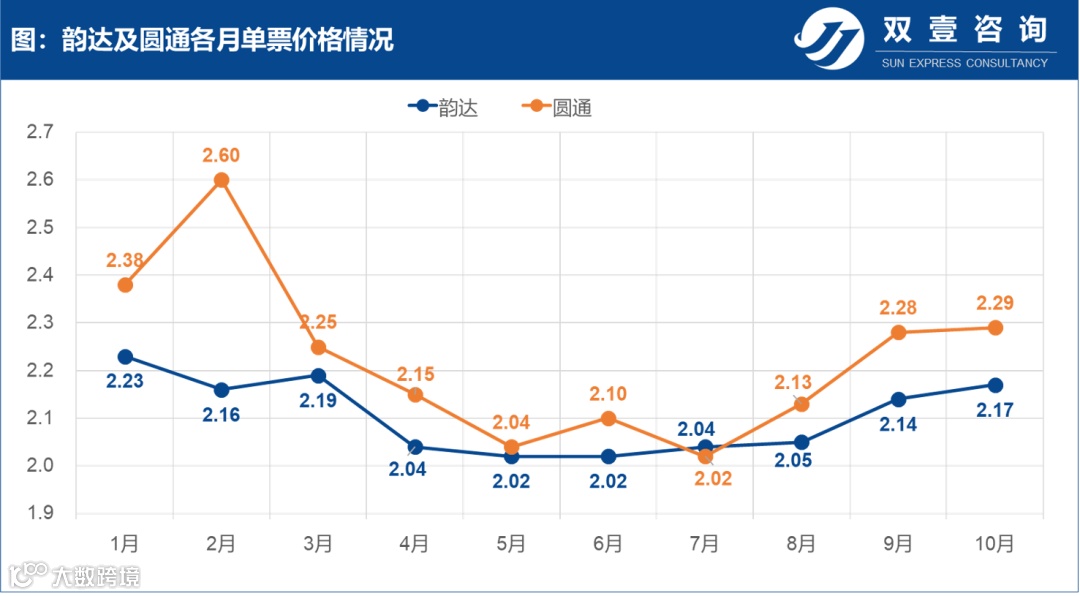 价:从单票价格表现来看,今年以来,除了7月份韵达单票价格略超圆通以外,其他月份圆通单票价格均高于韵达。从8、9、10月份的变化来看,两者单票价格差异还有继续拉大的可能。