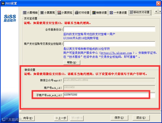 说明:图片中的子商户号为示例,非有效参数,请以经销商箱思迅软件总部申请时开通的子商户号为准。