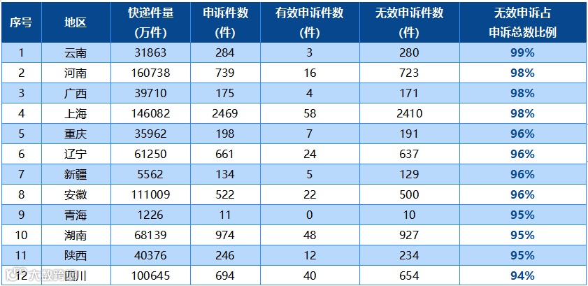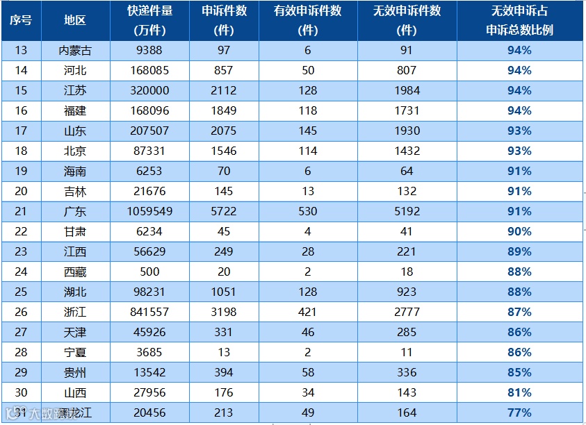 以排名第一的云南为例,无效申诉占申诉总数的比例为99%,这意味着每100个申诉单,最终只有1个申诉单界定为企业责任,剩余99个申诉单均为“无效申诉”。