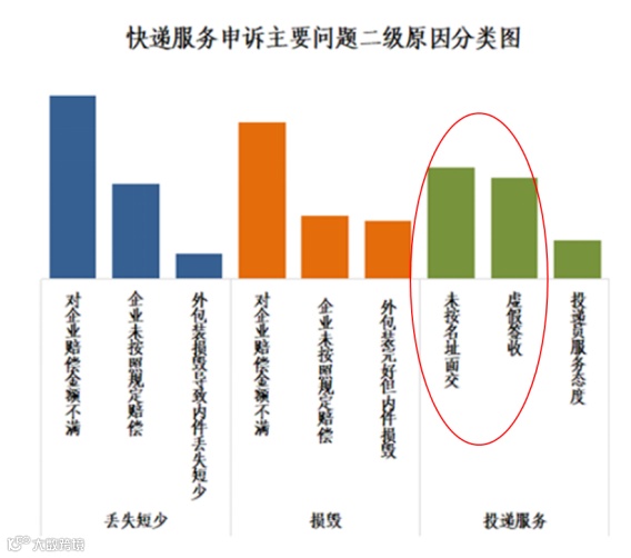 其中投递服务申诉中主要占比是未按地址面交和虚假签收,其实这两个问题多是跟没有送件上门有关。