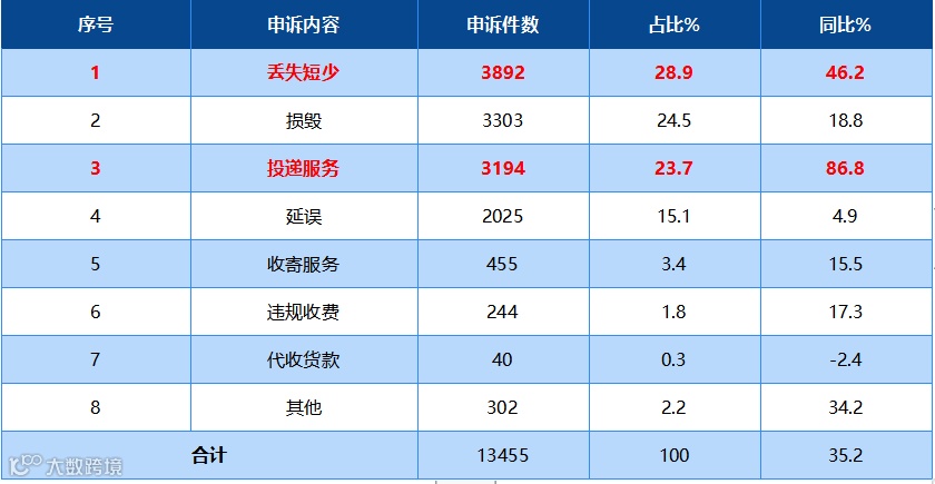 根据国家邮政局公布的数据:5月份,国家邮政局和各省(区、市)邮政管理局通过“12305”邮政业用户申诉电话和申诉网站共处理涉及快递服务问题的申诉13455件,环比下降24.3%,同比增长35.2%。