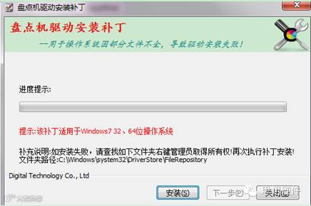 操作方法:执行“补丁安装包”中的DrPatch.EXE文件,如下图,点击“安装”按钮,按提示操作,直到提示“驱动安装成功”。