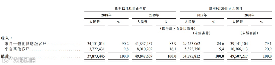 一体化供应链客户的收入,在京东物流总收入中的占比一直超过七成,而且其收入增速在持续提升——2019年增速是22.5%,2020年前三季度提升至33.8%。