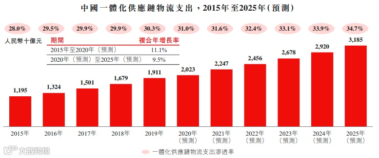 数据显示,2020年中国一体化供应链物流行业的市场规模将达到2万亿元,预计2025年增至3.2万亿元,渗透率从31%增至34.7%。而京东物流或将从中获益。
