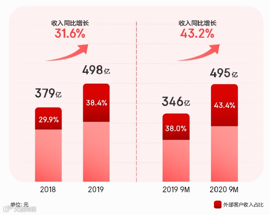 这带来的最直接影响是,京东零售的订单,变成了只是京东物流的收入来源之一。数据显示,京东物流的外部客户收入占比不断提升,从2018年的29.9%、2019年的38.4%,提升至2020年前9个月的43.4%。