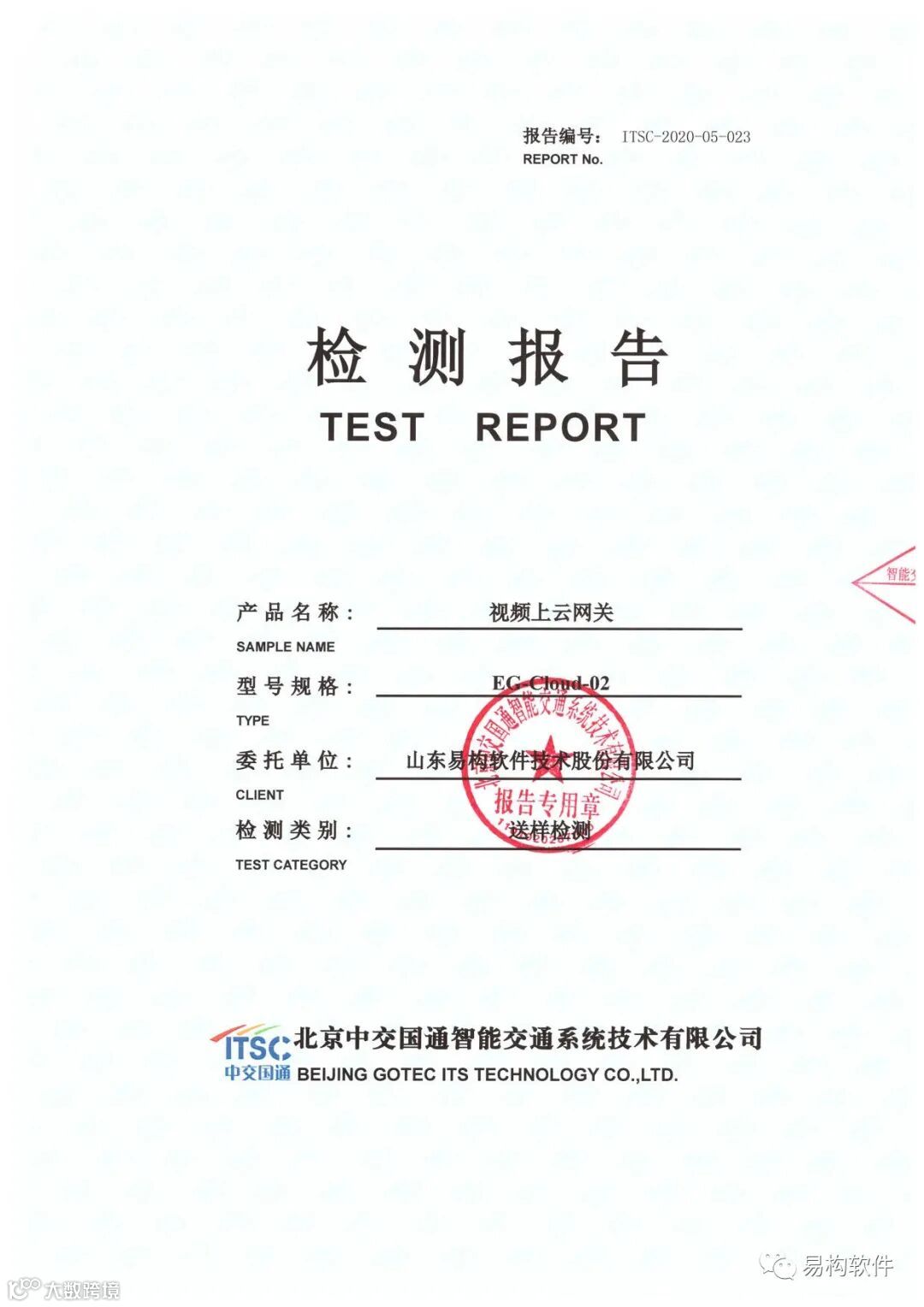 山东易构软件技术股份有限公司(以下简称“公司”)于近日取得由北京中交国通智能交通系统技术有限公司出具的关于“视频上云网关”产品的《检测报告》,确认该产品基本要求测试(设备稳定性、转码输出能力、智能分析接口)、国密VPN功能测试、平台对接测试等技术指标符合检测依据中所列标准的有关规定,满足全国高速公路视频云联网技术要求。