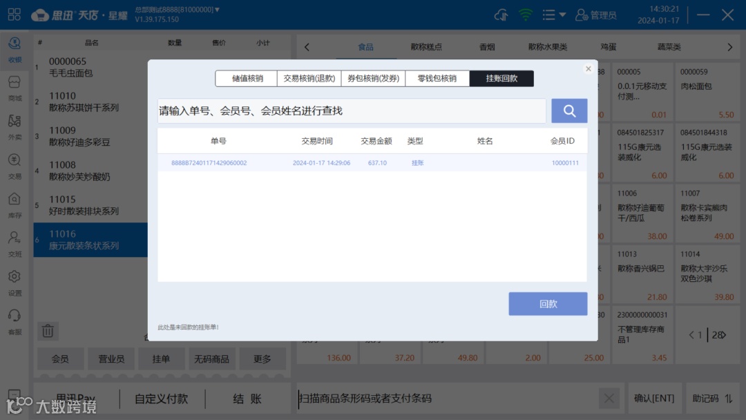 在星耀前台收银中,支持挂账管理,方便清晰化的收银,保障收银流畅。