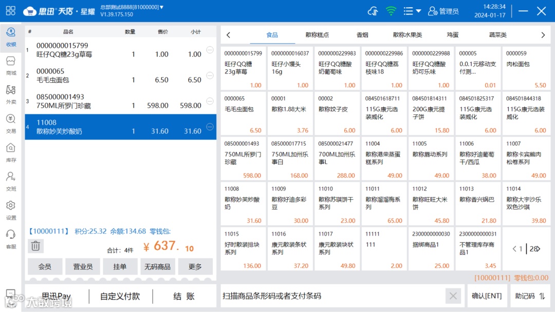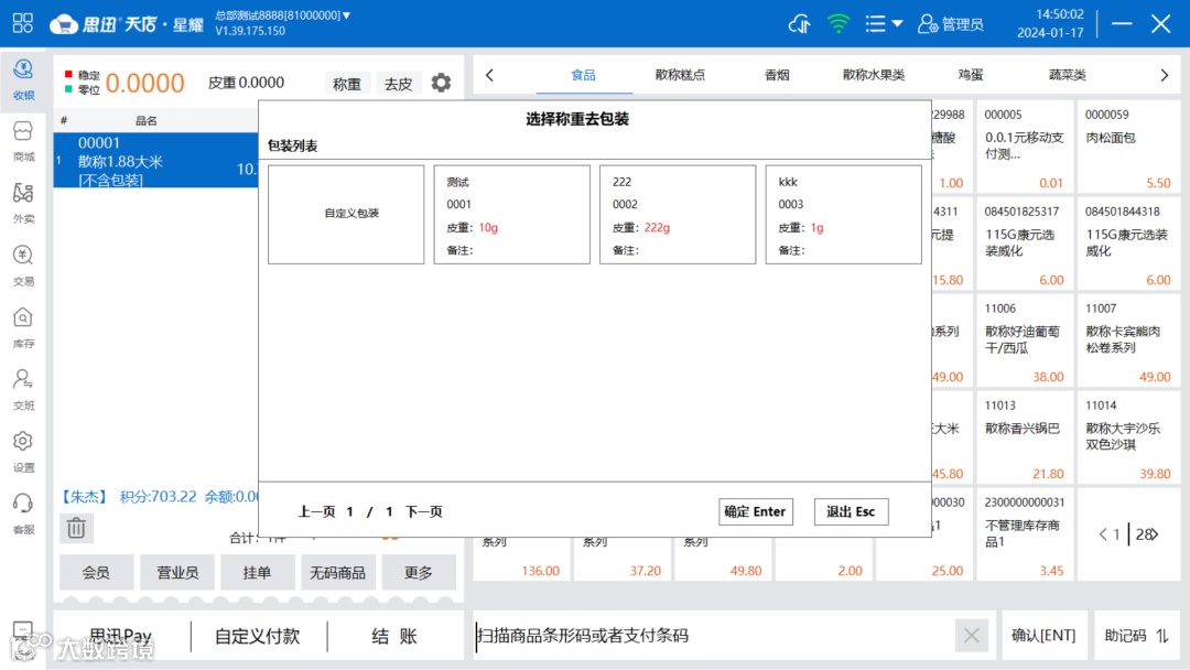在生鲜水果或烘焙、零食行业,常用到“去包装”功能,使用星耀的收银员可快速扣除果篮和零食礼包等包装重量,计算净重。