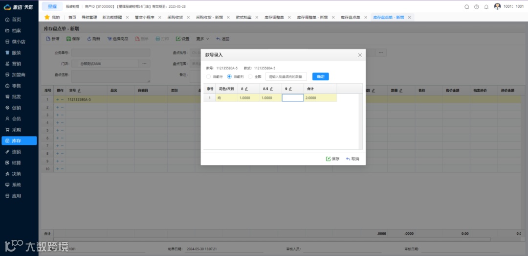 针对服装行业多花色多尺码的特殊需求,天店星耀在日常的进出库操作中引入了横花色、横尺码二维表格快速录入功能,提升采购入库的效率。