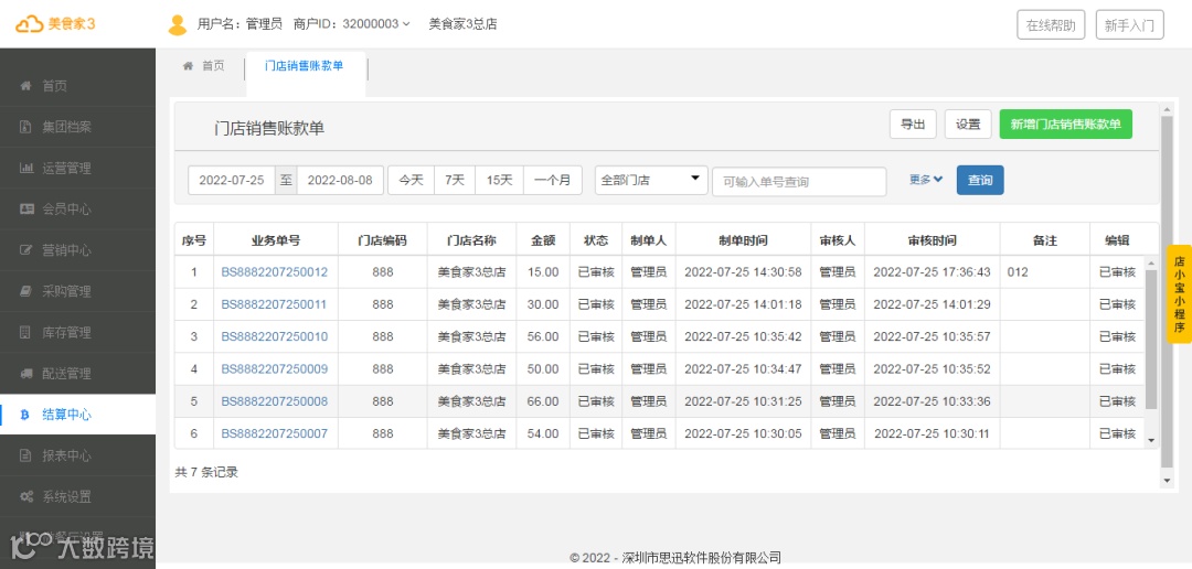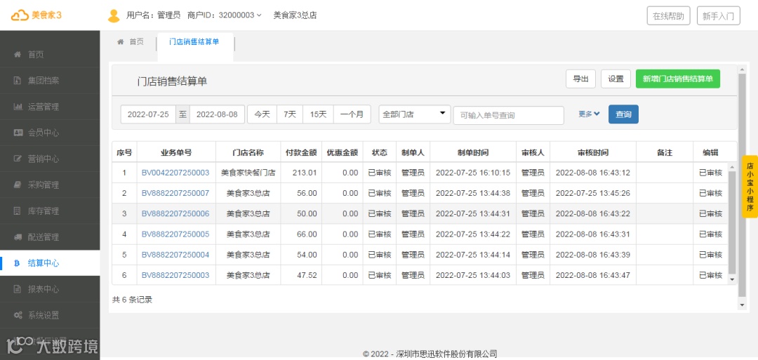 思迅美食家3「结算中心」正式上线!整合了供应商结算、配送结账结算,并针对美食广场、美食城、商业街、景区的业务需求新增了门店结算方案,能够实现多档口独立经营、统一管理。