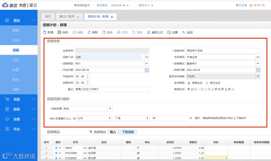 超市商品不仅种类繁多,并且同期不同种类商品优惠活动多样,怎样才能做到所有活动有序进行不杂乱?只需要在天店收银系统的后台中,在“促销管理”→“促销计划”中设置促销计划,添加“促销类型”,即可设置多种促销活动。