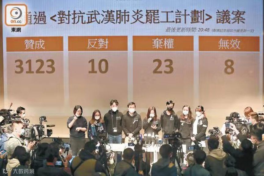 香港废青利用香港法律的便利条件,成立所谓的“医管局员工阵线”。2月1日废青们召开特别会员大会,投票决定是否罢工。该组织有近两万会员,此次有三千一百多名会员投票,获3123票支持,10票反对及23票弃权,大比数通过罢工。并已于2月3日开始罢工,不但罢工还忽视人群聚集的传染风险组织游行示威,其行为可谓“魔幻“,更令人心疼的是他们脸上配戴的口罩可能还是医院为医护人员配发的……