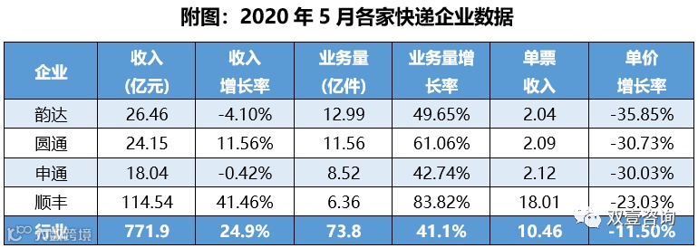 近日,各家快递公司纷纷公布了2020年5月快递服务业务经营简报,最新报告中的数据整理如下: