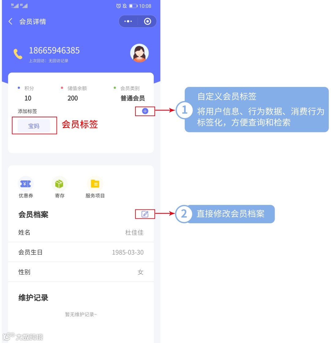 打开小程序随时随地给会员贴标签,修改会员档案信息,细化到每个会员,会员行为都能被记录。