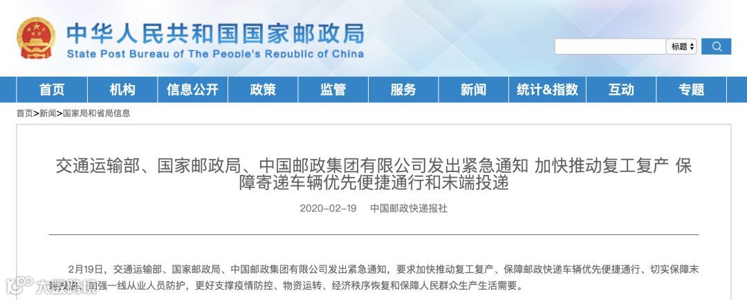 据国家邮政局网站消息,2月19日,交通运输部、国家邮政局、中国邮政集团有限公司发出紧急通知,要求加快推动复工复产、保障邮政快递车辆优先便捷通行、切实保障末端投递、加强一线从业人员防护,更好支撑疫情防控、物资运转、经济秩序恢复和保障人民群众生产生活需要。