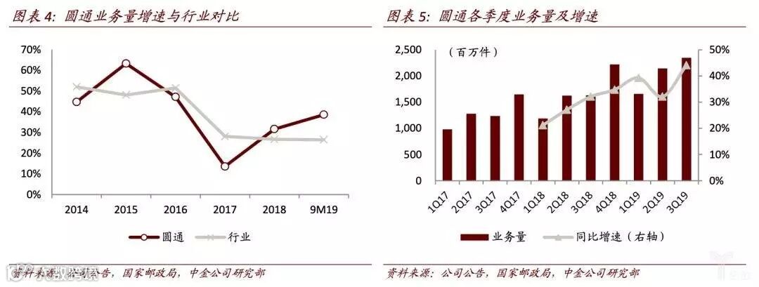 2019年,圆通则继续加速(二季度由于管理层更换出现内部政策调整不及时,增速短暂性放慢),尤其是3Q19增速达到44%,3Q19市场份额回到2015-2016年左右的水平。