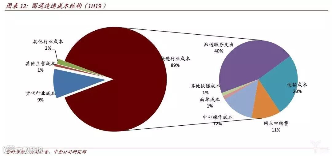 公司的成本结构主要为(1H19数据):快递行业成本(89%)、货代行业成本(9%,主要是圆通国际的货代业务)和其他主营成本(2%,主要是航空货运对外业务的成本)、其他业务成本(1%,主要是辅料、包装物销售等)。
