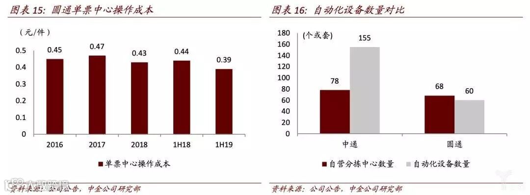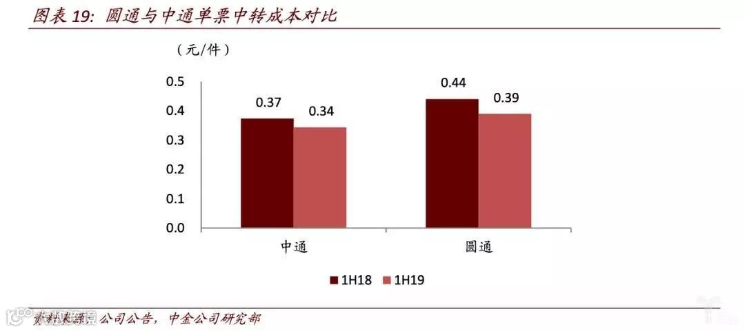 公司从2018年开始发力成本管控,2018/1H19单票快递产品成本同比下降8%、12%,主要通过降低干线运输成本和中心操作成本。考虑到圆通的成本基数依然较高,公司的各项举措需逐步产生效果,我们预期成本管控将持续发力,单票成本仍有下降空间。