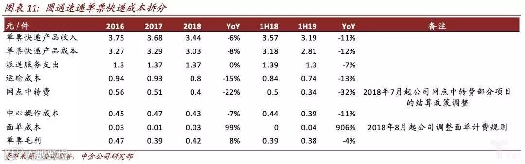从2018年开始,圆通发力成本管控,取得了阶段性的成果,根据公司年报和半年报公布的口径,2018/1H19单票快递产品成本同比下降8%、12%,单票毛利同比上涨8%、下跌4%。