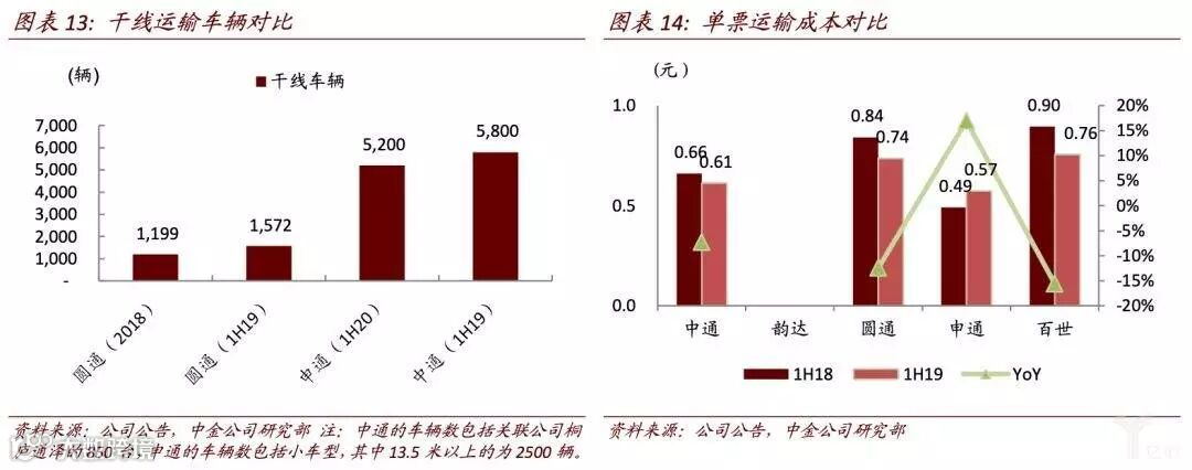考虑到公司目前自有干线车辆数量仍远低于同行,且单票成本高于同行业,我们认为随着前述战略和措施的实施,圆通的单票运输成本仍有下降空间。