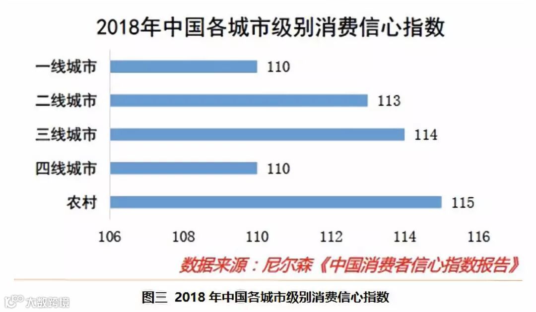 下面是消费支出(参见图二),与收入相对应的,农村人的消费支出增速比城镇居民快得多,这也能够反映他们消费意愿很强。由于下沉市场普遍房贷、房租、车贷各方面的压力比一二线城市小得多,对于可支配收入消费信心是更强烈,尼尔森2018年中国城市级别消费信心指数(参见图三),三线城市包括农村整个消费信心指数比一二线城市要强,这让很多人是很惊讶的。