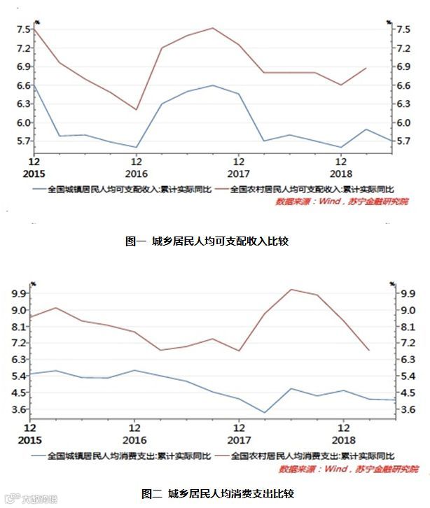 下沉市场的上升,但是近些年上升态势很明显。如图(参见图一),城乡居民收入增速的比较,红色的部分是农村居民的收入增速、蓝色的线是城镇的。虽然说农村居民绝对收入水平并不高,但是增速一直领先于城镇。
