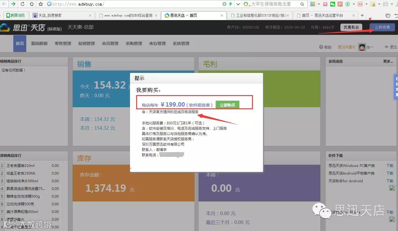 点击续费界面,请注意提升下方文字部分:请联系天店授权服务商,是与用户相关联的经销商。不同地区的用户相关联经销商折不同。