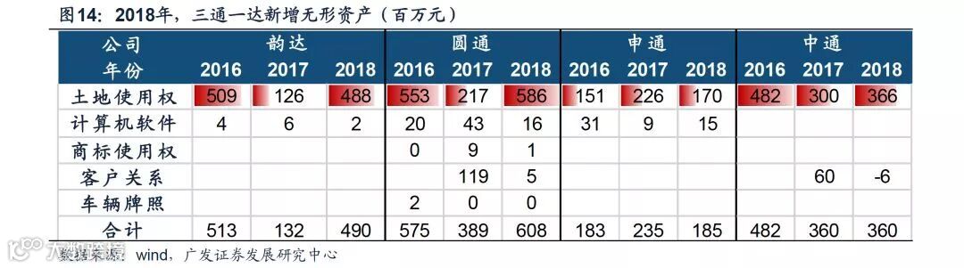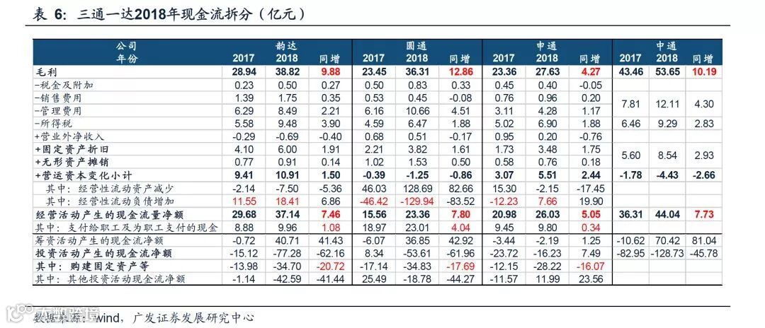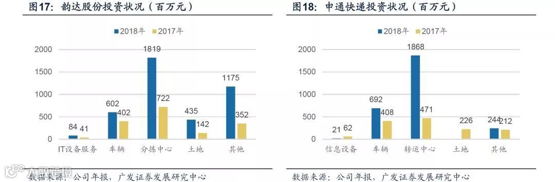 2018年,加盟快递净利润增速都在30%以上,经营性现金流大幅改善;此外,三通一达均加大产能投入,韵达、圆通、申通、中通固定资产净值分别同增约25.55亿元、29.54亿元、17.34亿元、33亿元,韵达的投资总额达到41亿元。