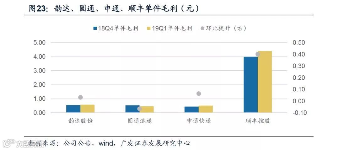 2019Q1,申通、韵达、顺丰单件毛利均环比18Q4显著提升,其中,韵达单件毛利为0.58元,较2018Q4提升0.03元(+5.9%);申通单件毛利0.52元,较18Q4环比提升0.06元(+14.34%);顺丰单票毛利4.4元,较18Q4环比增长0.4元(+10%)。