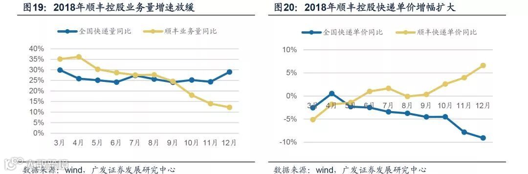 进一步的,我们用韵达、圆通、申通的月度经营数据作为样本,对快递相对增速(公司快递量增速减去行业增速)和单价同比下降额进行了线性回归分析,模型拟合显著。从拟合曲线来看,总部快递单价同比下降0.1元,快递量增速跑赢行业5pcts;假设2019年行业增速为23%,那么将对应28%的快递量增速。结合上述毛利分析,牺牲单件毛利对总利润的边际贡献太低,因此快递单件毛利将趋稳。