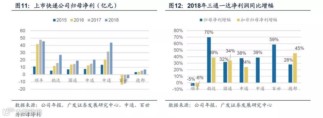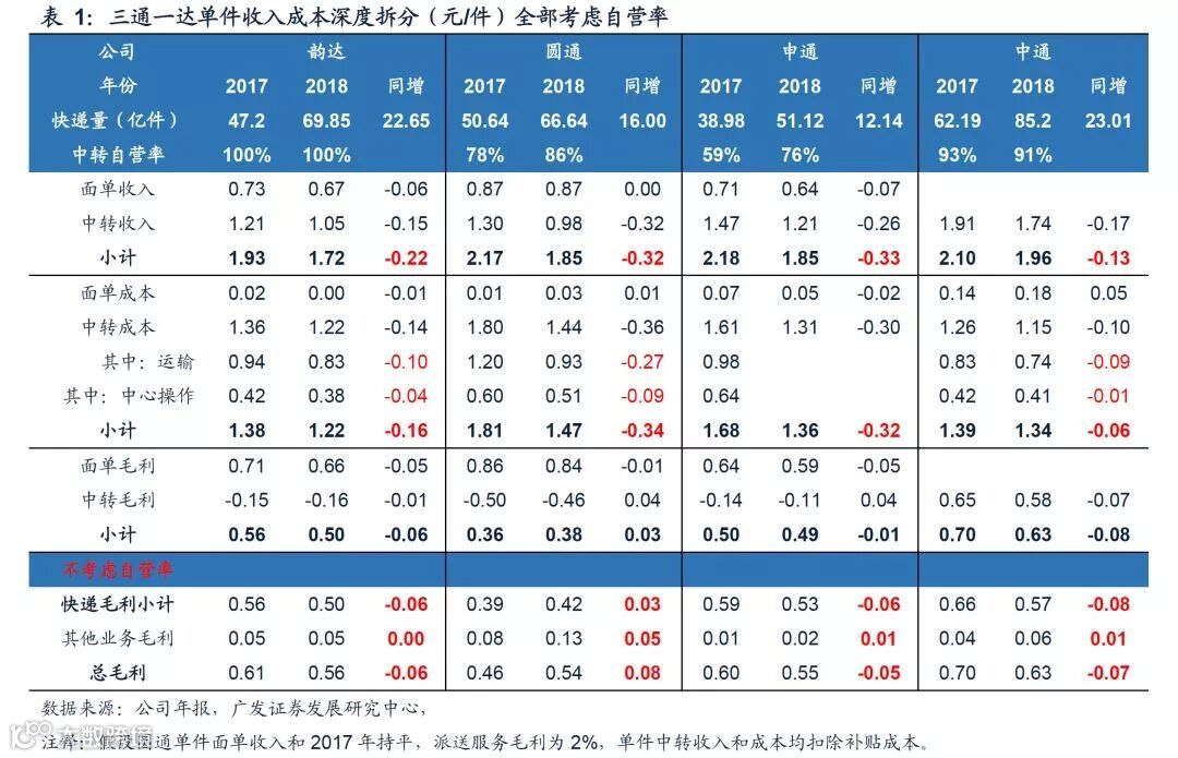 总体来看,三通一达2018年都不同程度地下调了快递费率,但下调幅度和成本端的优化幅度基本匹配。圆通、申通在成本下降幅度最大,费率下调也最大,快递量增速随之大幅回升,但下调费率并未对这两家的快递单件毛利产生较大负影响。