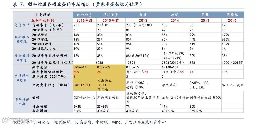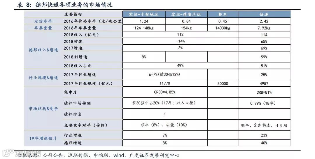 2018年,顺丰和德邦的新业务都在快速扩张。顺丰的重货、冷运、国际、同城业务收入分别同比增长83%、85%、29%、172%;德邦的快递业务收入同比增长65%,快递占营收的比超过了快运主业。
