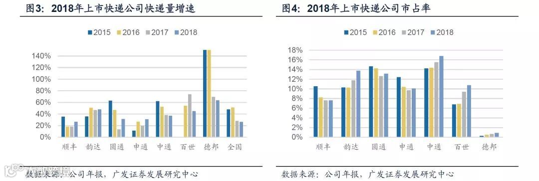 2018 年,全国快递量同增26.6%,其中,韵达、圆通、申通、中通、百世快递量分别同增 47.99%、31.61%、31.13%、37.00%、45.12%;市占率分别为 13.77%(+1.99pcts)、13.14%(+0.5pcts)、10.08%(+0.35pcts)、16.8%(+1.28pcts)、 10.79%(+1.38pcts);同比2017年,韵达市场份额超越圆通成行业第二,百世集团超越申通成行业第四。