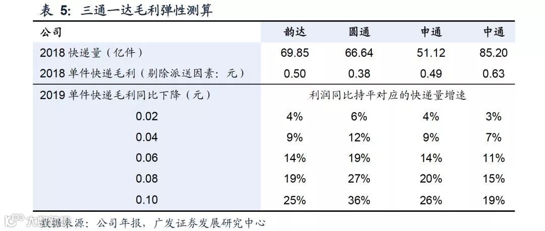 我们测算了2019年三通一达在不同的单件快递毛利降幅情况下,实现利润同比持平所对应的快递量增速,例如,圆通2019年单件快递毛利下降0.1元,那么快递量增速需要达到36%,才能实现快递毛利同比持平。