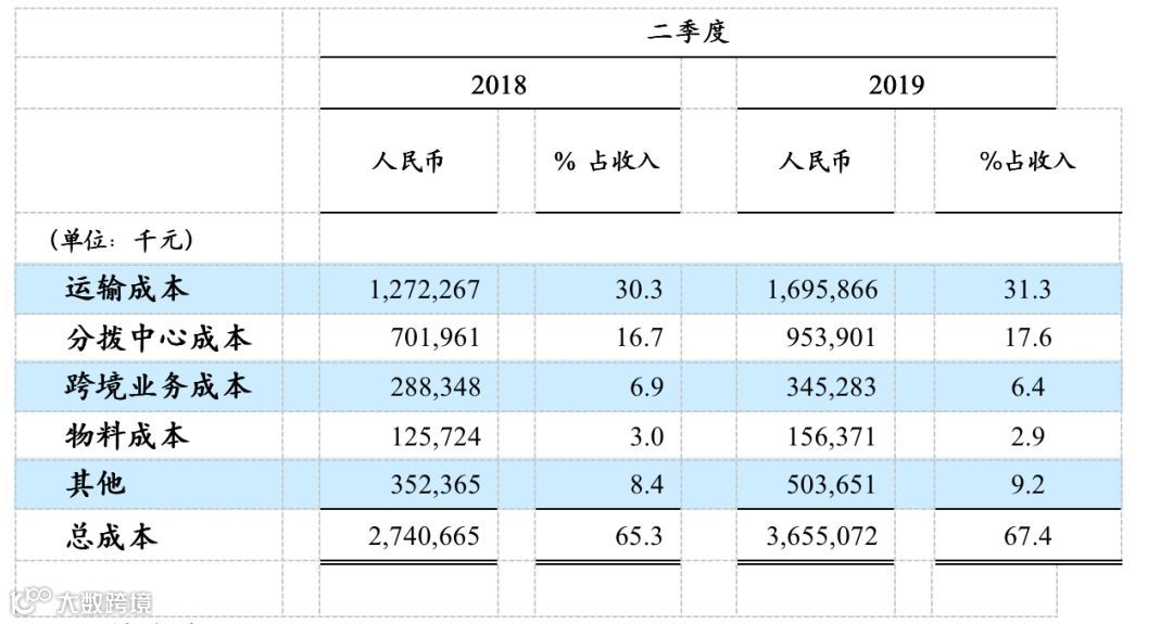 2019年第二季度营业成本同比增长33.4%至36.55亿元。扣除3.45亿元的跨境业务成本后,单票成本为1.07元,较上年同期下降0.09元。